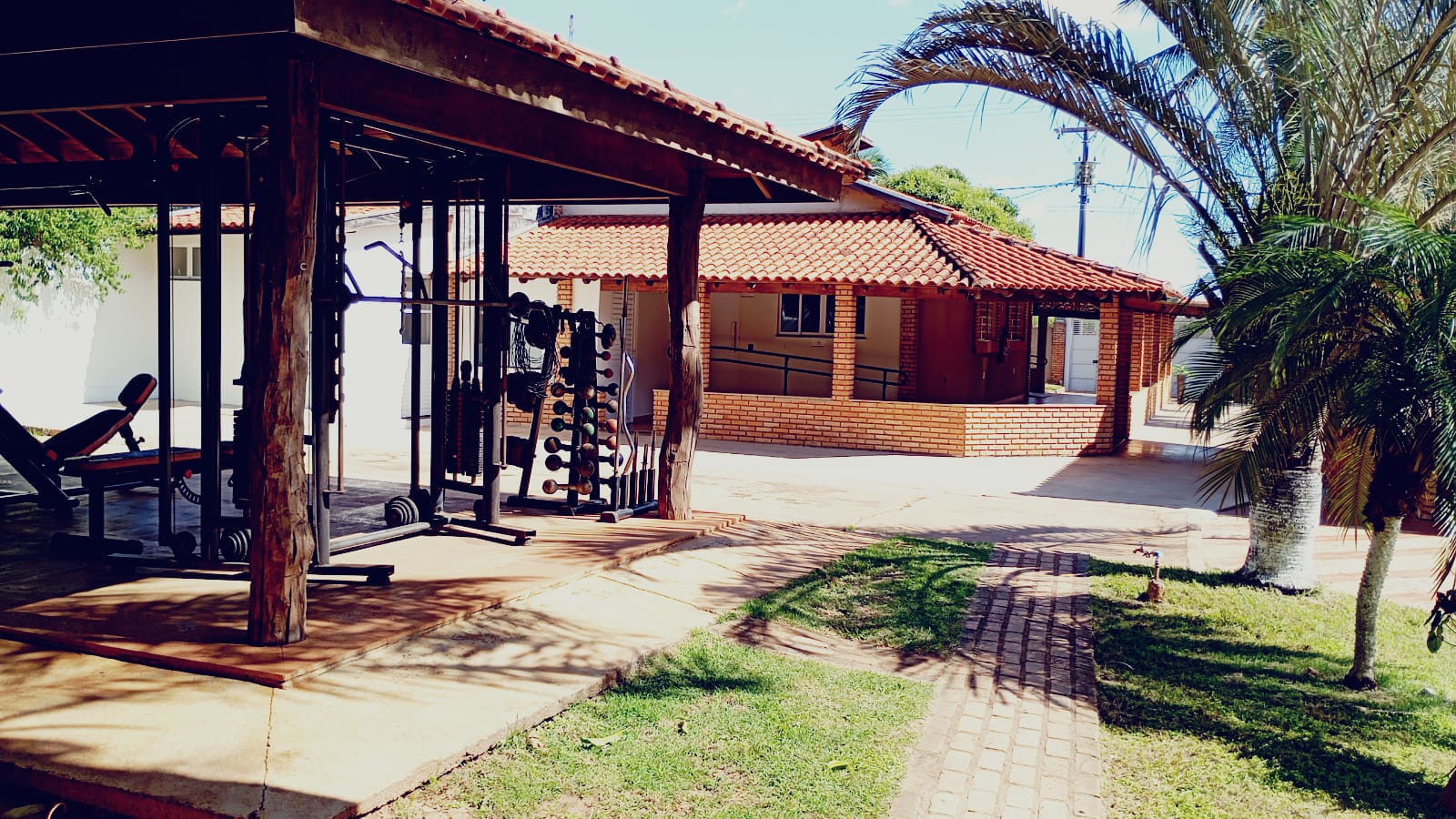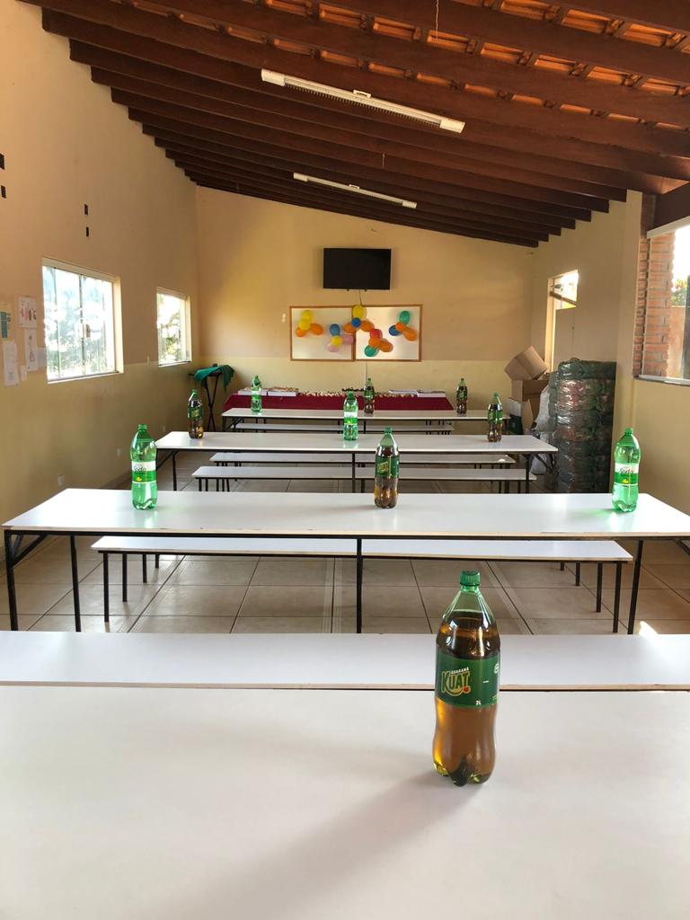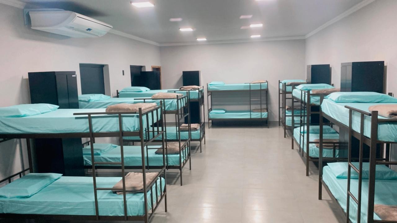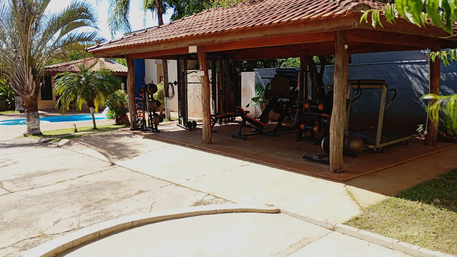 Ambientes equipados com piscina, academia, campo e quadra para esportes, refeitório, além de uma área ampla.