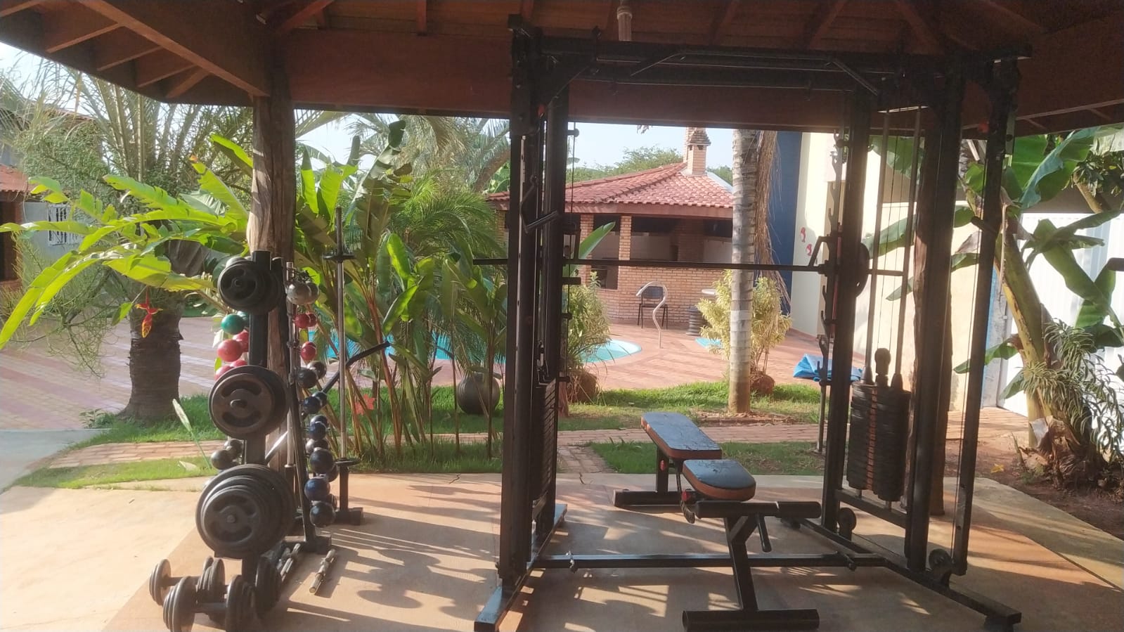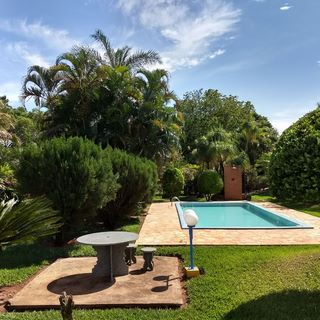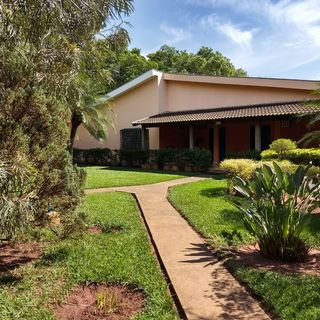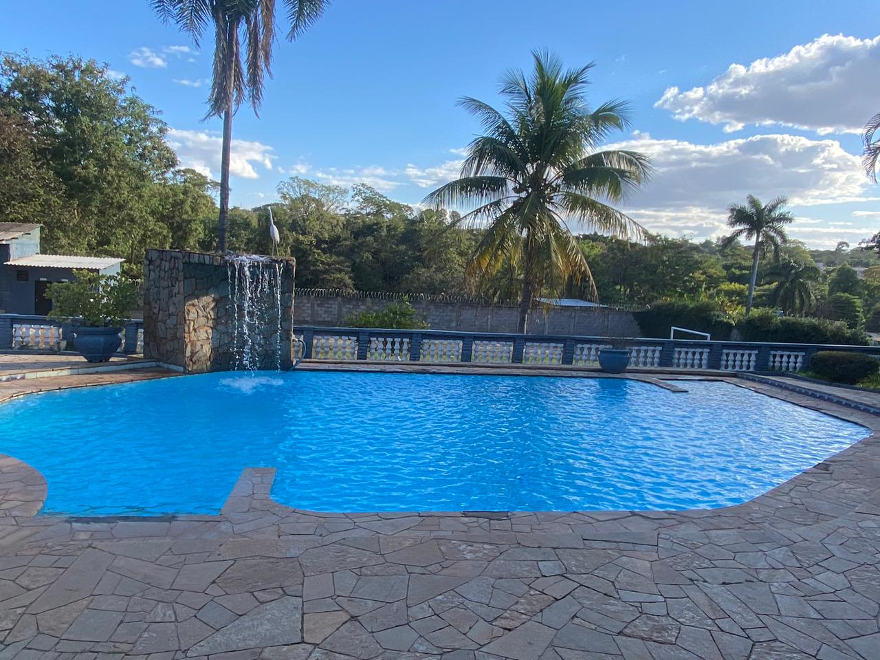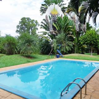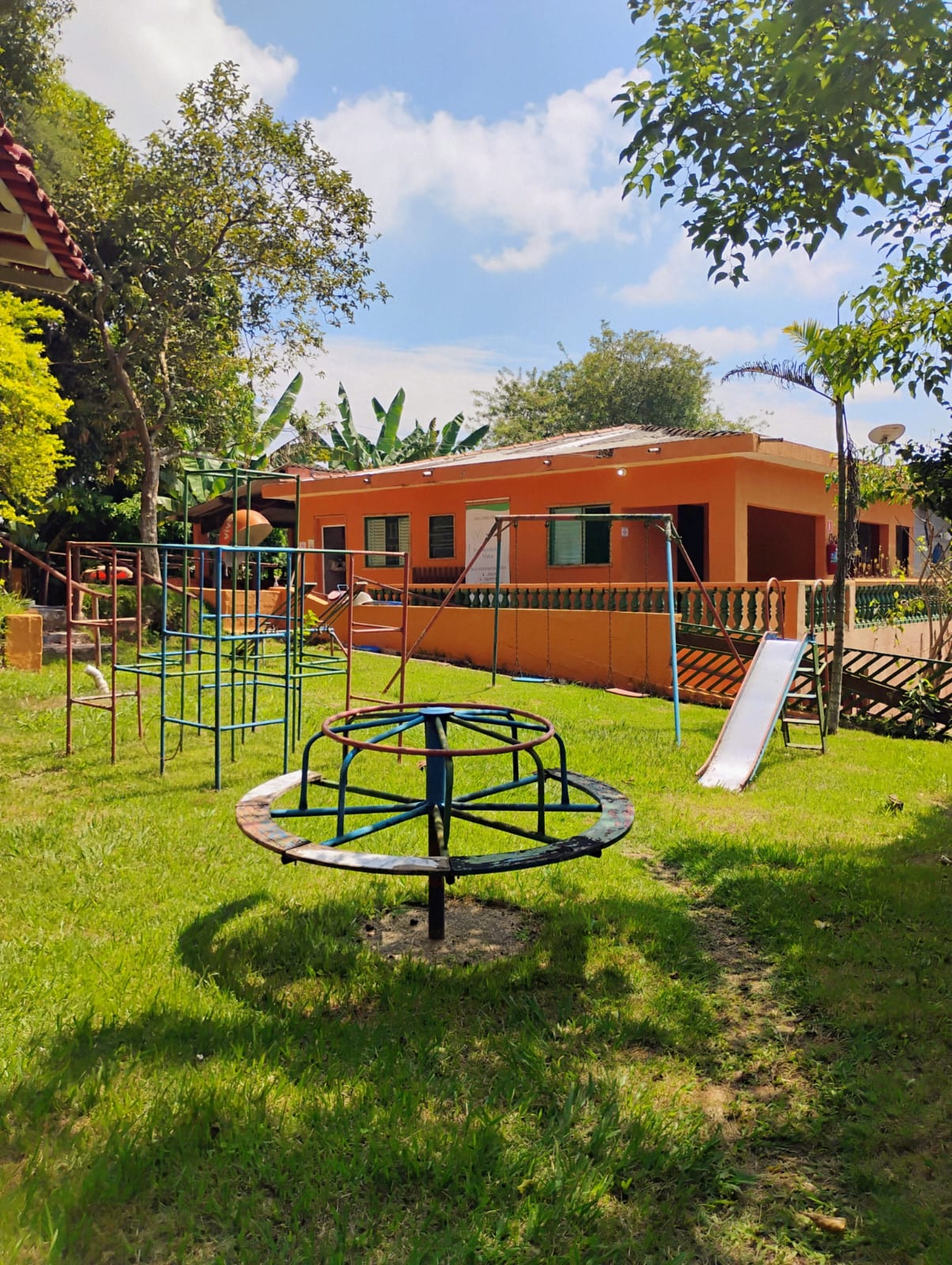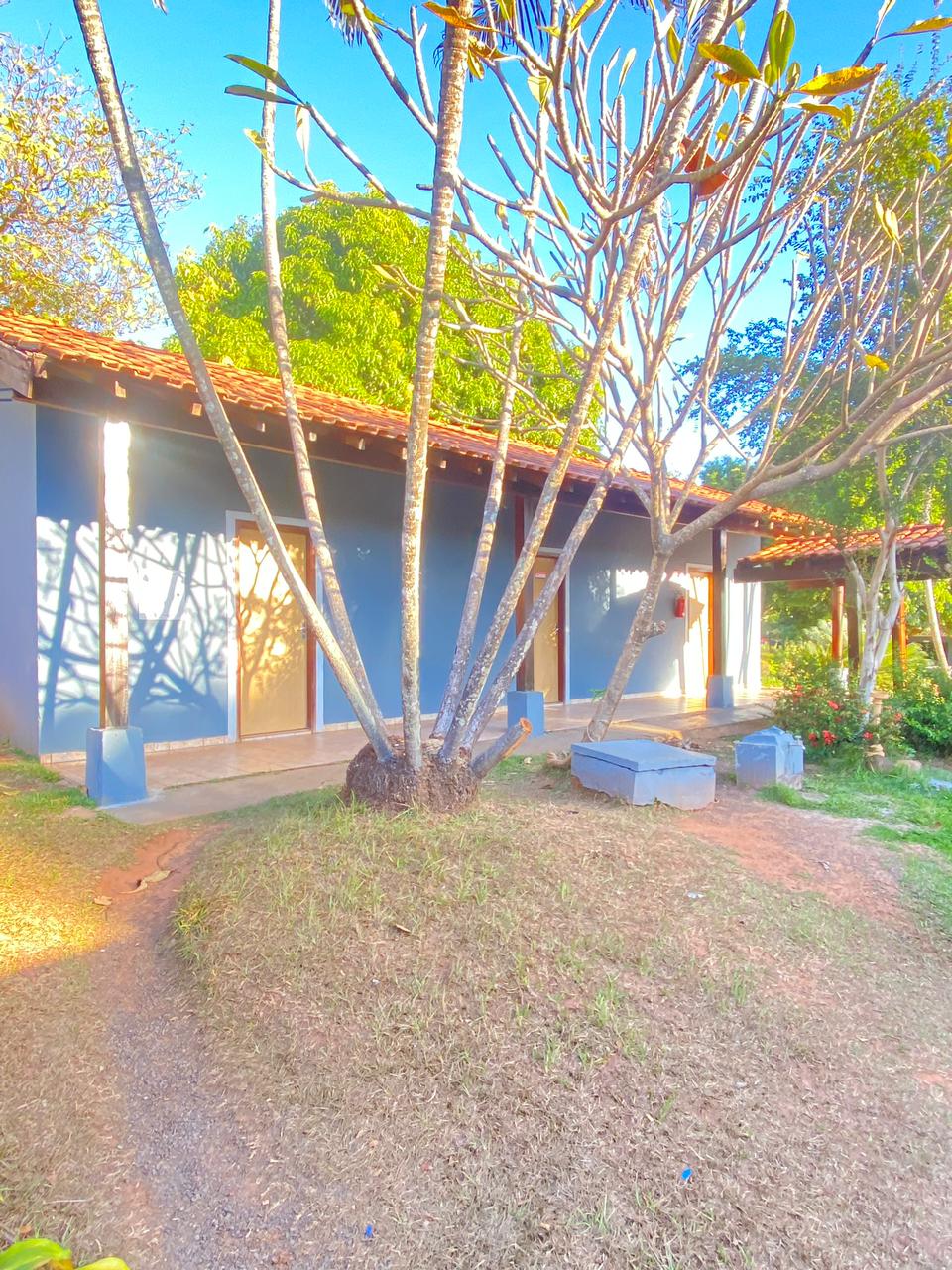Ambientes equipados com piscina, academia, campo e quadra para esportes, refeitório, além de uma área ampla.